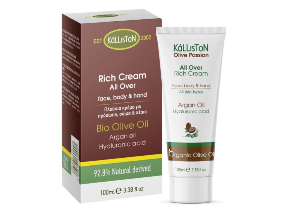 Kalliston krém All Over Rich pro obličej, tělo a ruce je krém bohatý na výživné máslo, kyselinu hyaluronovou a vitamíny, určený pro péči o pleť. Obsahuje směsi olejů z organického olivového oleje, avokádového oleje, másla z karité a ve spojení s kyselinou hyaluronovou zvyšuje hydrataci a elasticitu. Vitamin E a provitamin B5 (panthenol) pokožku vyživují a poskytují dodatečnou péči a ochranu.