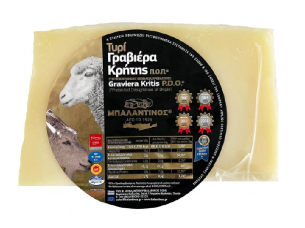 Graviera - sýr z kozího a ovčího mléka. Graviera sýr Baladinos je tradiční řecký sýr, který nabízí několik potenciálních zdravotních přínosů. Je bohatý na vápník pro zdravé kosti, obsahuje kvalitní bílkoviny pro růst a regeneraci tkání a je zdrojem důležitých minerálů jako hořčík, zinek a fosfor. Dále obsahuje antioxidanty, které pomáhají chránit tělo před volnými radikály. Nicméně, vzhledem k vysokému obsahu tuku je důležité konzumovat Graviera sýr Baladinos s mírou a začlenit ho do vyvážené stravy pro celkově zdravý životní styl.