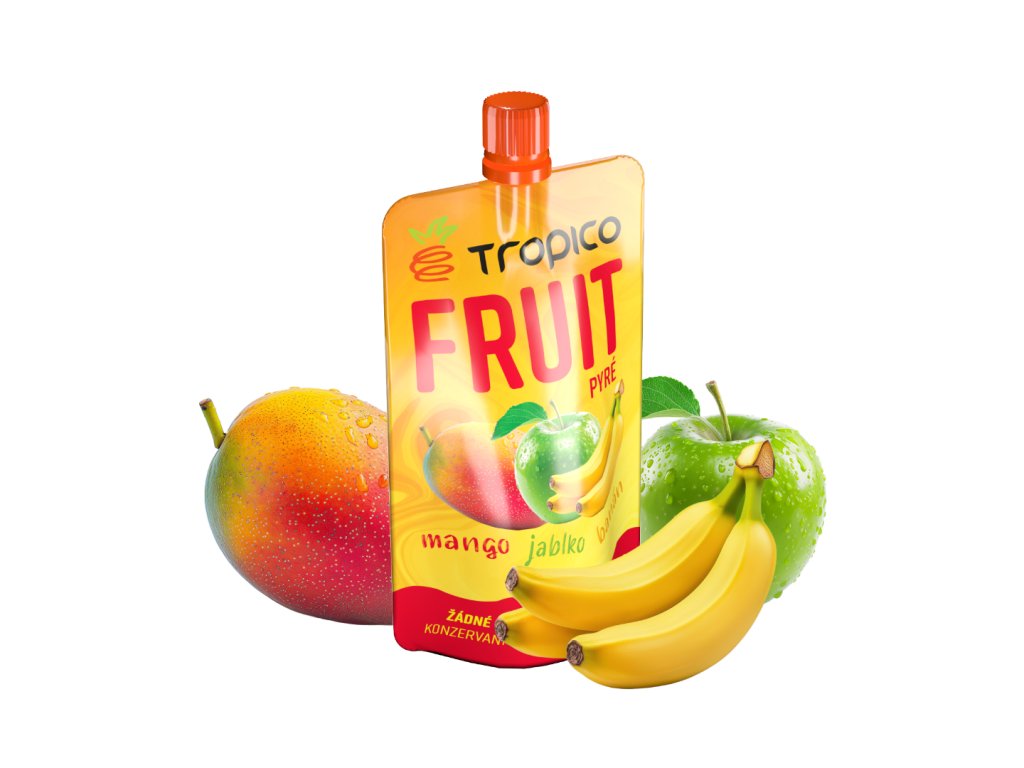 Složení: mangové pyré 40%, jablečné pyré 30%, banánové pyré 21%, jablečná šťáva 8,5%, citronová šťáva 0,5%